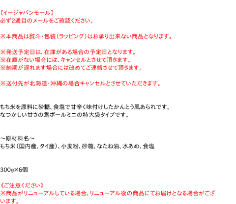 〜原材料名〜 もち米(国内産、タイ産)、小麦粉、砂糖、なたね油、水あめ、食塩 300g×6個【広告文責】株式会社イージャパンアンドカンパニーズ 072-875-6666《ご注意ください》 ※商品がリニューアルしている場合、リニューアル後の商品にてお届けとなる場合がございます。