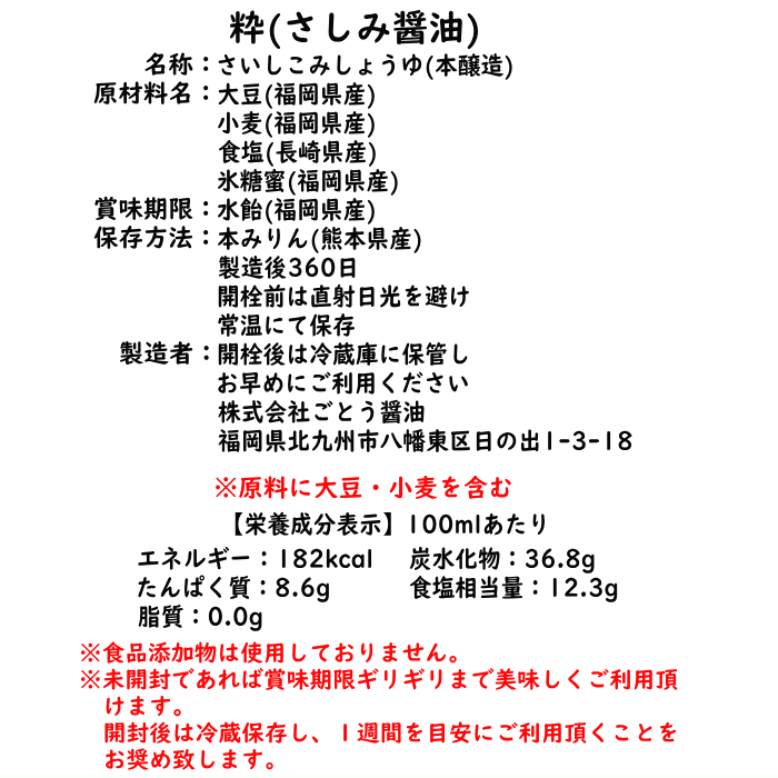 さしみ醤油(粋) 名称: 原材料名: 賞味期限: 保存方法: 製造者: こいくちしょうゆ(本醸造)大豆 (福岡県産フクユタカ) 小麦 (福岡県産チクゴイズミ) 食塩 (長崎県産崎戸塩) 氷糖蜜 (福岡県産) 水飴 (福岡県産) 本みりん (熊本県産) 製造より360日 直射日光を避け常温にて保存 株式会社ごとう醤油 福岡県北九州市八幡東区 栄養成分表示(100ml)当たり エネルギー: たんぱく質: 脂質: 炭水化物: 食塩相当量: 182kcal 8.6g 0.0g 36.8g 12.3g 【ギフト用途】 御歳暮 お歳暮 お中元 内祝 快気祝い 誕生日お祝い 母の日 父の日 敬老の日 出産祝い 【包装紙】 和風(赤) 和風(青) 花模様 【のしシール】 祝 内祝 寿 お中元 お歳暮 ご出産祝 お誕生日おめでとう おめでとうございます ありがとうございます 感謝 お見舞 お父さんありがとう THANKS MOTHER1,900円 レターパック送料込 200ml 540円 3,500円 送料無料 (北海道・沖縄宛送料 1,000円) ギフト包装・のしシール対応 500ml 900円 3,300円 送料無料 (北海道・沖縄宛送料 1,000円) ギフト包装・のしシール対応 5,800円 送料無料 (北海道・沖縄宛送料 1,000円) 10,000円 送料無料 (北海道・沖縄宛送料 1,000円) 簡易包装・短冊のし対応 業務用 大サイズ 15,000円 送料無料 (北海道・沖縄宛送料 1,000円) ※賞味期限製造日から30日製造元より直送致します。