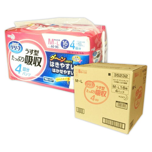 リリーフ うす型 たっぷり吸収 4回分 パンツタイプ M〜L 16枚 × 4パック 【花王 kao】【35232】